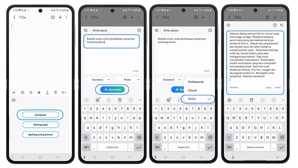 Bayangkan kamu adalah seorang pebisnis baru yang harus mempresentasikan produknya ketika pitching. Tantangan utamanya adalah menemukan kata-kata yang pas untuk membuka presentasi, agar tidak terdengar kaku atau canggung. Dengan bantuan AI Composer di Z Flip6, kamu bisa membuat kalimat pembuka yang menarik, sehingga presentasinya terasa lebih lancar dan profesional. Caranya pun mudah:
