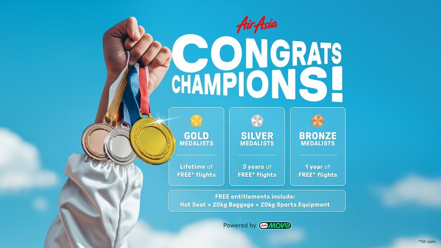 Para atlet akan menerima insentif penerbangan GRATIS* yang diberikan oleh AirAsia dan didukung oleh AirAsia MOVE (sebelumnya dikenal sebagai AirAsia Superapp).