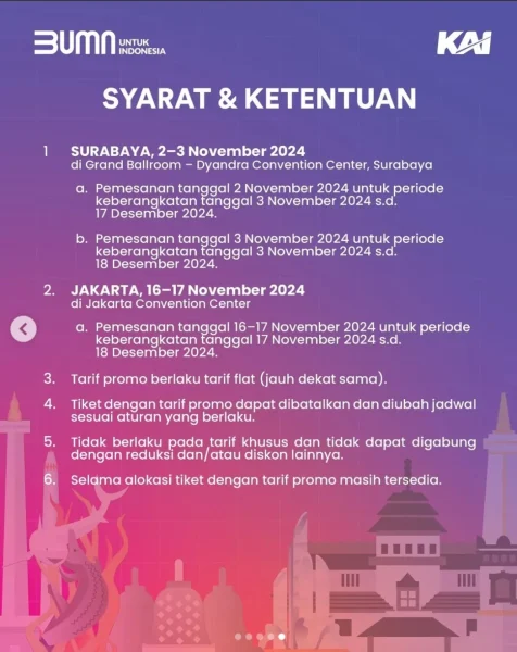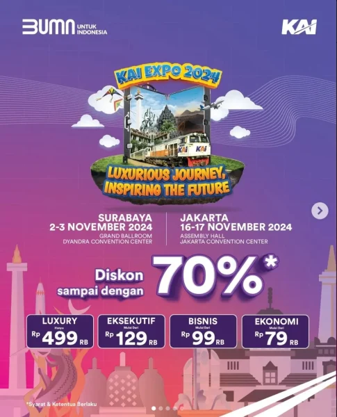 Tiket promo ini hanya dapat dibeli oleh pengunjung KAI Expo 2024 dan harga tiket masuk untuk penyelenggaraan KAI Expo di Surabaya sebesar Rp40.000 dan Jakarta Rp50.000.