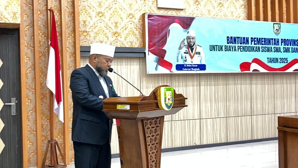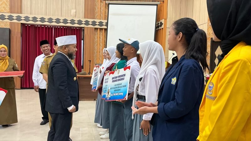 Gubernur Bengkulu, Helmi Hasan, menyerahkan bantuan Pemerintah Provinsi Bengkulu untuk biaya pendidikan siswa SMA, SMK, dan mahasiswa asal Pulau Enggano di Aula Merah Putih Kantor Gubernur Bengkulu, Senin (11/8).