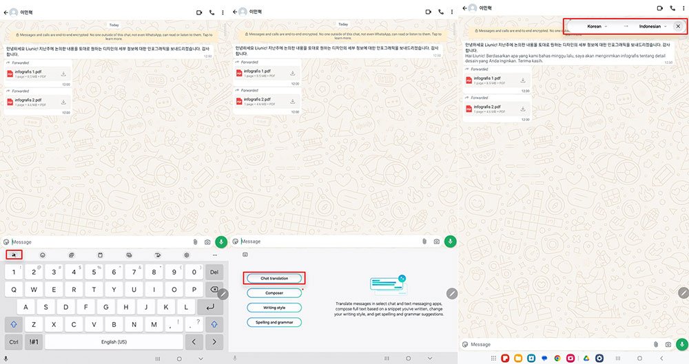 Selain itu, Galaxy AI di tablet ini juga mempermudah komunikasi penggunanya ketika sedang chatting dengan lawan bicara dengan bahasa yang berbeda. Kamu bisa dengan mudah menggunakan fitur Chat Assist (Chat Translation) untuk menerjemahkan arti pesan yang dikirimkan teman atau rekan bisnis ke bahasa Indonesia. Berikut adalah cara menggunakan fitur Chat Assist di Galaxy Tab S10: