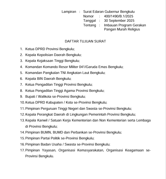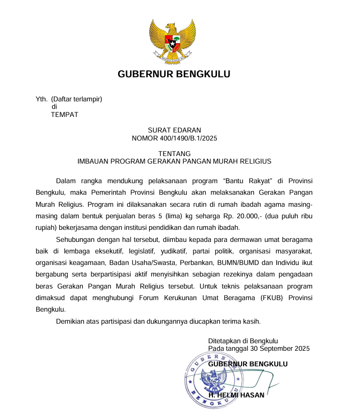 Pemerintah Provinsi Bengkulu resmi meluncurkan Program Gerakan Pangan Murah Religius sebagai bagian dari upaya mendukung program Bantu Rakyat. Melalui program ini, masyarakat dapat membeli beras 5 kilogram dengan harga Rp20.000 secara rutin di rumah ibadah masing-masing.