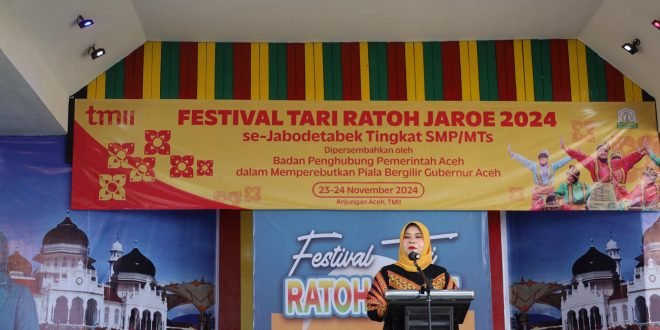 Jakarta–Penjabat Ketua Dekranasda Aceh Hj, Safriati, S.Si, M.Si resmi membuka Festival Tari Ratoh Jaroe Nasional yang diadakan Badan Penghubung Pemerintah Aceh (BPPA) di Anjungan Aceh, Taman Mini Indonesia Indah, Jakarta, Sabtu 23 November 2024.