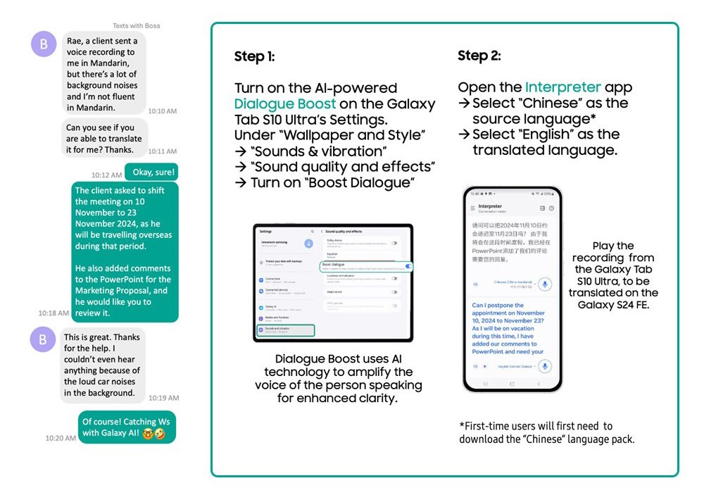 Saat rekan kerja mengirimkan rekaman suara, tapi tidak terdengar dengan jelas, kamu tidak perlu khawatir! Ikuti cara Rae dalam memakai fitur Dialogue Boost dan Interpreter untuk mempermudah pekerjaanmu. Kamu bisa memakai fitur dialogue boost untuk meningkatkan kejernihan suara yang diterima, serta fitur interpreter untuk menerjemahkan secara langsung isi pesan dalam rekaman suara tersebut jika kamu tidak memahami bahasa yang digunakan oleh sang pengirim. Kedua fitur ini bisa membantu kamu untuk memahami pesan secara mendalam dan menangkap detail-detail penting yang dibutuhkan untuk menyelesaikan pekerjaanmu.