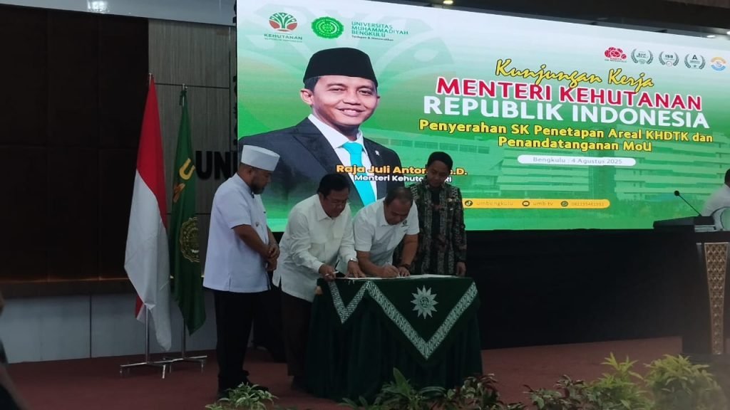 Gubernur Bengkulu, Helmi Hasan, menyatakan dukungan penuhnya terhadap kerja sama antara Universitas Muhammadiyah Bengkulu (UMB) dan Kementerian Kehutanan RI dalam pengelolaan Kawasan Hutan dengan Tujuan Khusus (KHDTK). Hal ini disampaikannya saat mendampingi kunjungan kerja Menteri Kehutanan RI, Raja Juli Antoni, di Aula Gedung Hassan Dien, Kampus IV UMB, Senin pagi (4/8/2025).