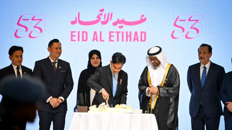 Mewakili Presiden Prabowo Subianto, Wakil Presiden (Wapres) Gibran Rakabuming malam ini, Selasa (03/12/2024), menghadiri acara Resepsi Peringatan Hari Nasional (National Day) Ke-53 Uni Emirat Arab (UEA) di Hotel Raffles, Jl. Prof. Dr. Satrio Kav. 3-5, Kuningan, Jakarta Selatan.