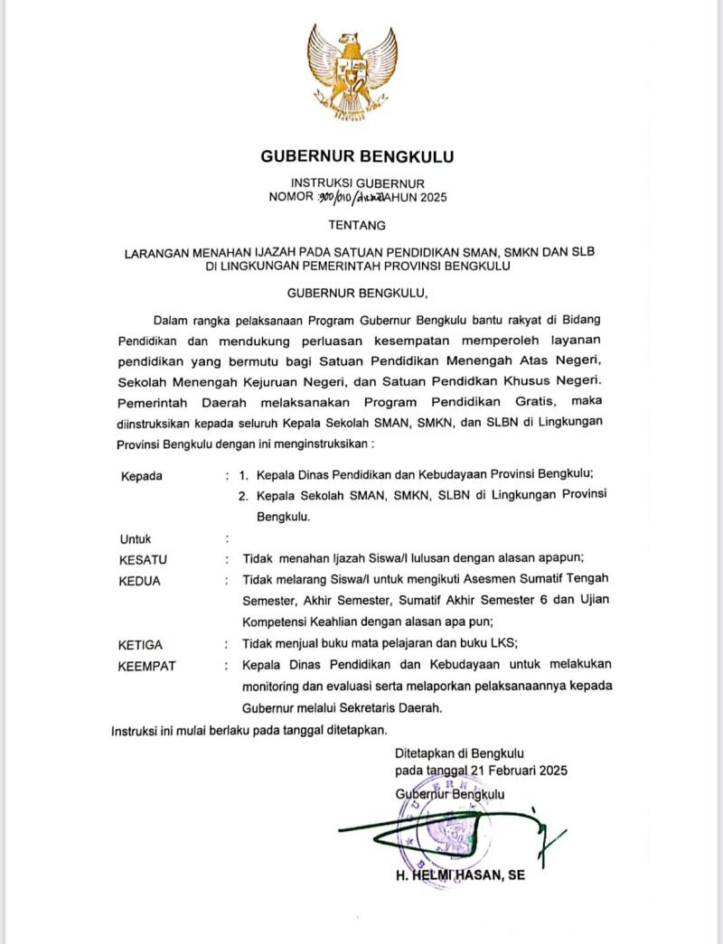 Instruksi ini tertuang dalam Surat Instruksi Gubernur Bengkulu Nomor 900/010/DIKBUD/2025 yang mengamanatkan seluruh satuan pendidikan untuk memastikan hak siswa dalam memperoleh ijazah mereka tanpa hambatan administratif.