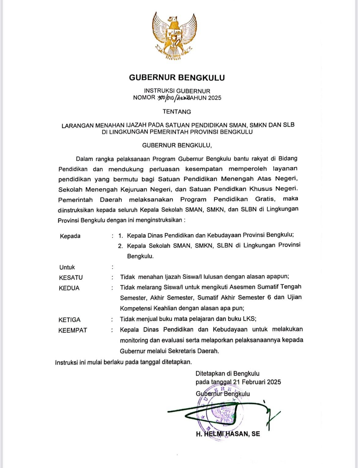 Tak hanya di sektor kesehatan, di hari pertama kepemimpinannya, Helmi Hasan juga mengeluarkan kebijakan penting di bidang pendidikan. Ia menegaskan bahwa sekolah-sekolah di bawah naungan Pemerintah Provinsi Bengkulu, termasuk SMA, SMK, dan SLB, dilarang menahan ijazah siswa dengan alasan apa pun.