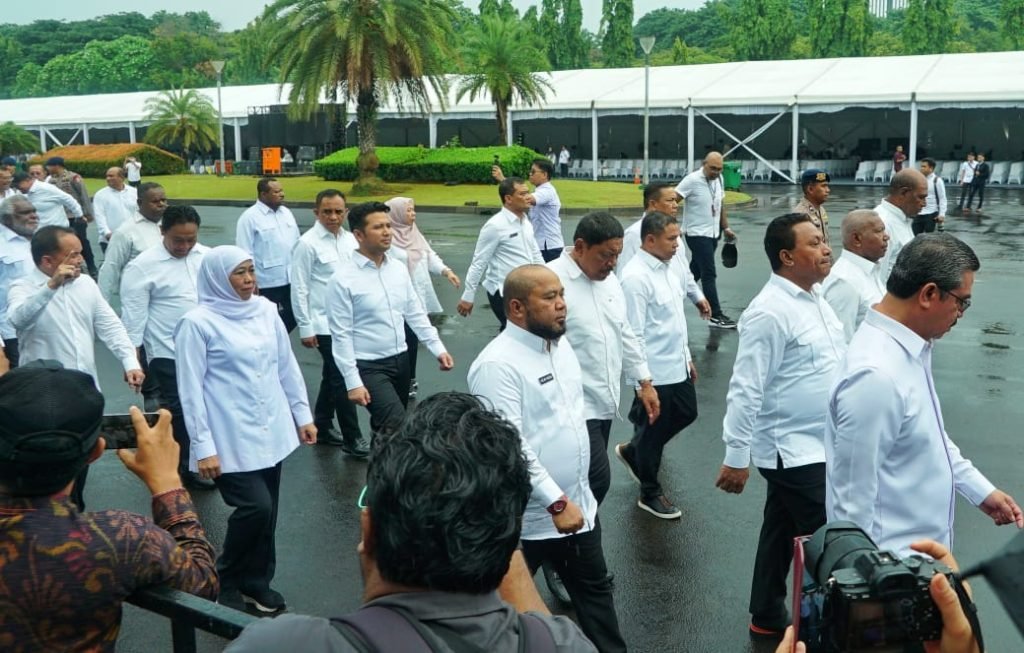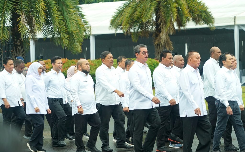 Meski gerimis menyelimuti ibu kota, prosesi tetap berjalan dengan khidmat. Para kepala daerah terpilih mengikuti rangkaian acara dengan penuh keseriusan, di mana barisan gubernur dan wakil gubernur berada di posisi terdepan, diikuti oleh rombongan wali kota dan bupati terpilih.