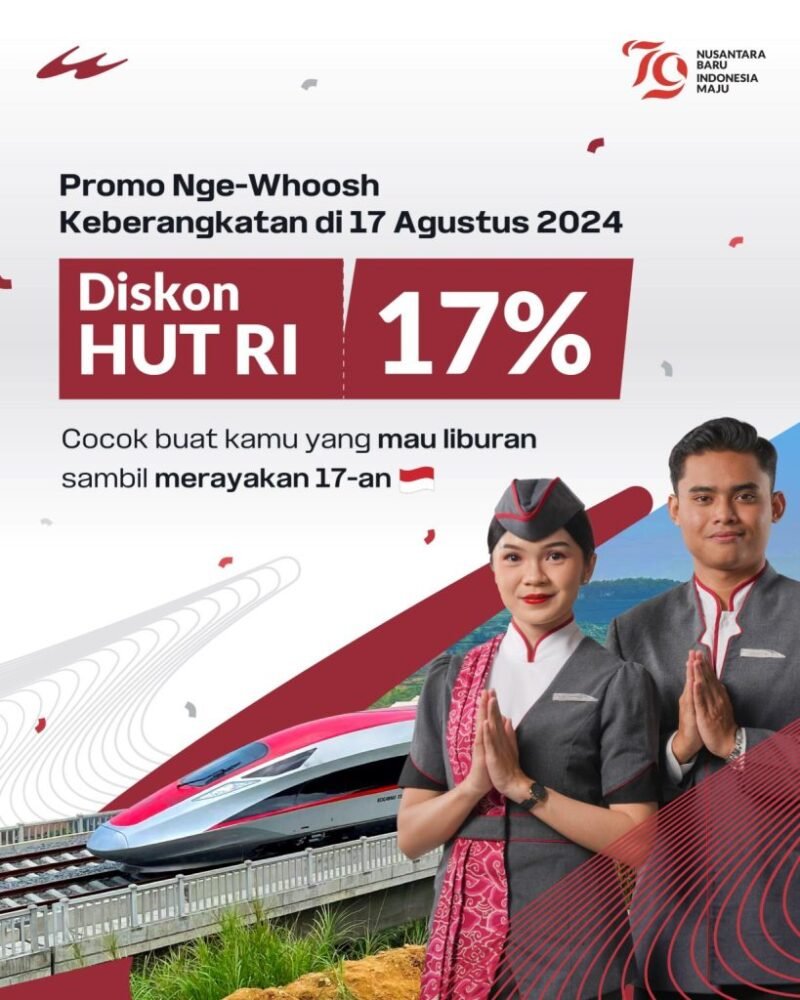 “KCIC terus berkomitmen untuk memberikan layanan terbaik dan inovasi bagi masyarakat Indonesia. Melalui promo Diskon HUT RI 17% ini, kami berharap semakin banyak masyarakat yang dapat merasakan kenyamanan dan kecepatan perjalanan dengan kereta cepat Whoosh,” tutup Eva.
