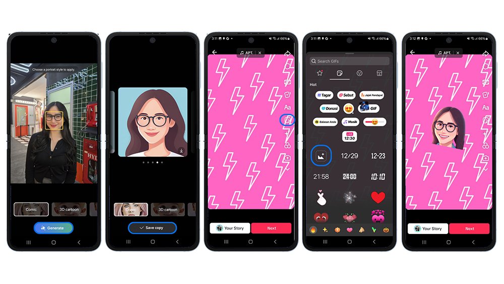Galaxy Z Flip6 hadir dengan Portrait Studio, sebuah fitur canggih yang memungkinkan kamu untuk menciptakan stiker unik dari selfie secara cepat dan mudah, menjadikan kontenmu semakin standout. Dengan Portrait Studio, foto selfie-mu bisa langsung diubah menjadi stiker bergaya AI yang kreatif sesuai tren visual yang kamu inginkan, mulai dari comic, watercolor, hingga 3D cartoon atau sketch. Caranya mudah, yaitu: