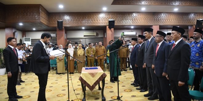 BANDA ACEH— Gubernur Aceh, Muzakir Manaf, mengambil sumpah dan melantik pejabat pimpinan tinggi pratama (eselon II), pejabat administrator (eselon III) dan pejabat pengawas (eselon IV) dalam lingkungan Pemerintah Aceh, di Aula Serbaguna Kantor Gubernur Aceh, Senin, (19/5/2025).