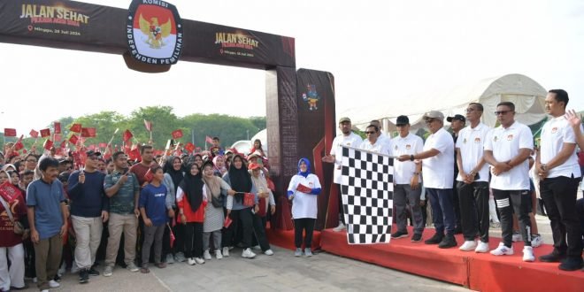 BANDA ACEH— Pj Gubernur Aceh Bustami, melepas ribuan peserta jalan sehat Pilkada Aceh 2024 yang digelar Komisi Independen Pemilihan (KIP) Aceh, di Taman Ratu Safiatuddin, Minggu, (28/7/2024).