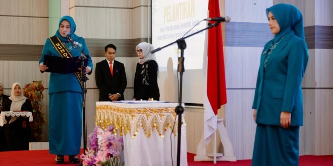 SABANG–Ketua Tim Penggerak PKK Aceh, Marlina Muzakir, melantik Nuri Zulkifli sebagai Ketua TP PKK Kota Sabang, Ketua Dekranasda, Forikan, Bunda PAUD dan Ketua Pembina Posyandu Kota Sabang masa jabatan 2025-2030, di Aula Kantor Wali Kota Sabang, Sabtu, (14/6/2025).