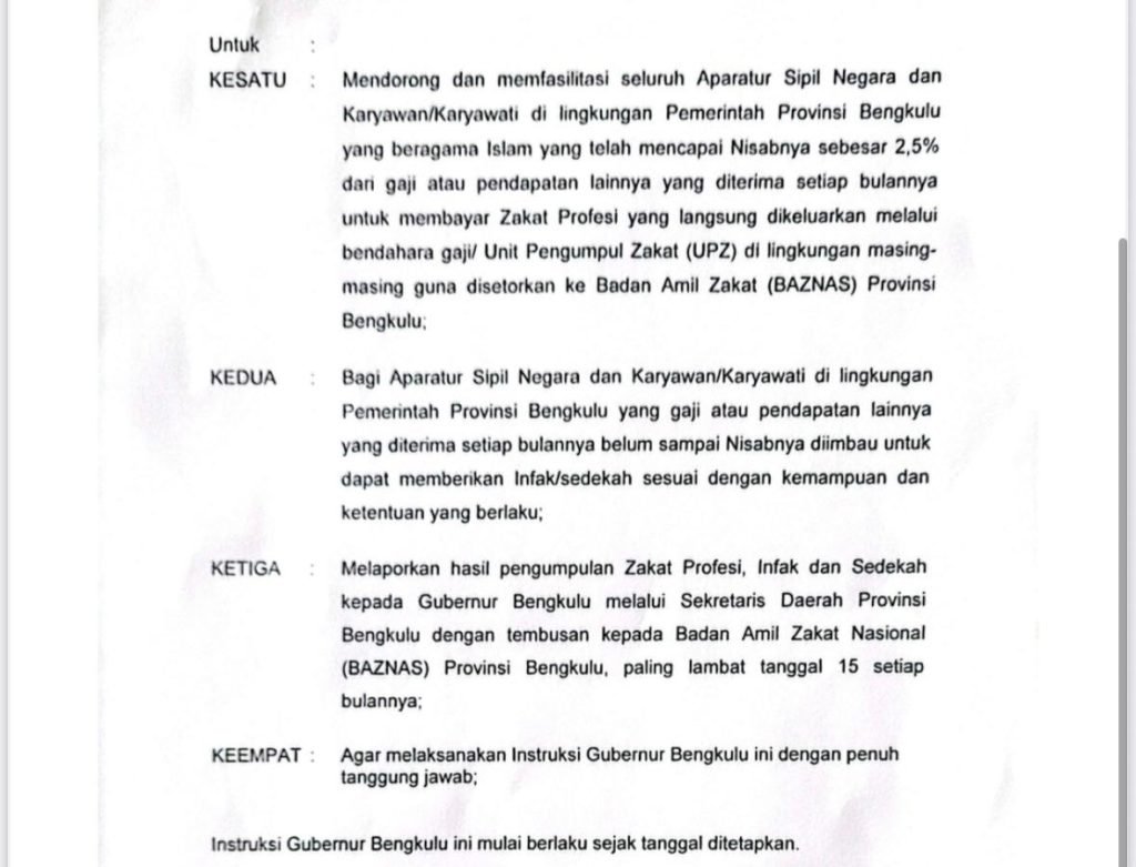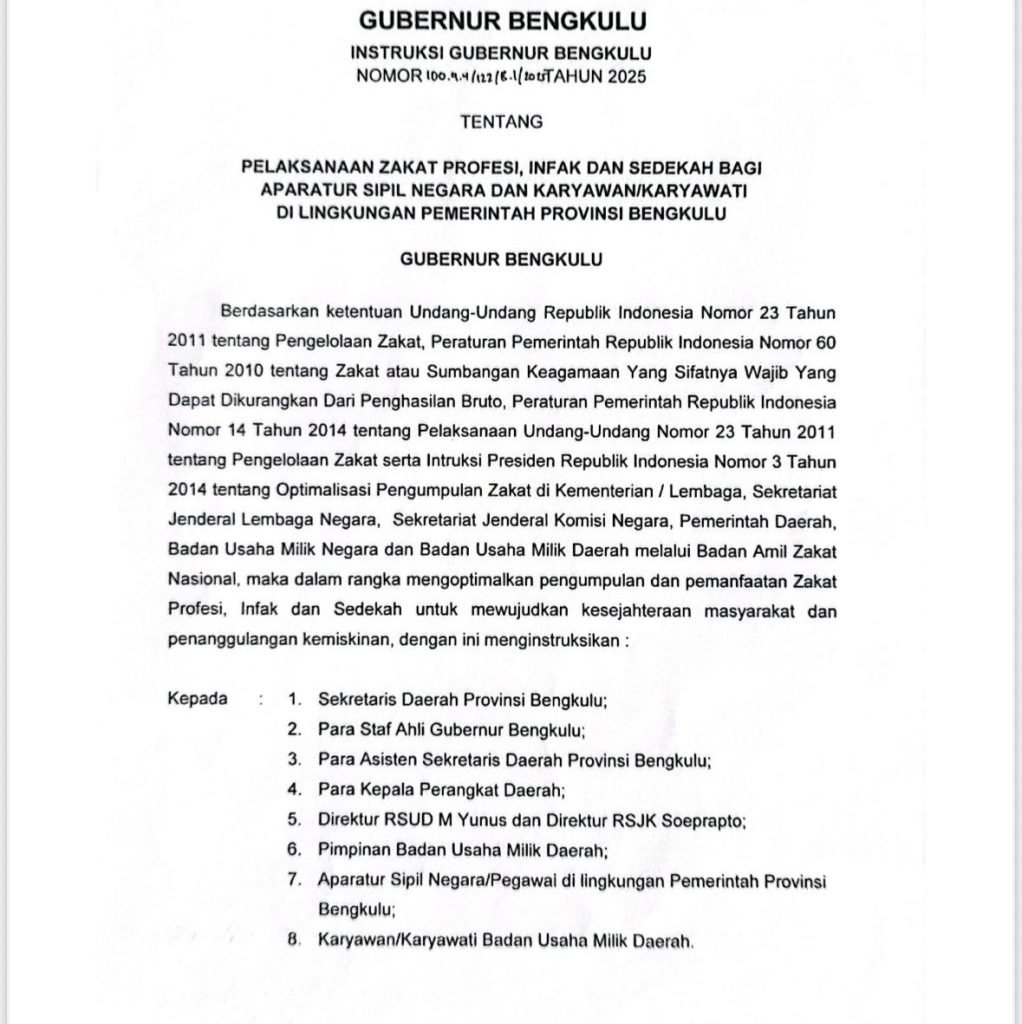 Dalam semangat menunaikan kewajiban yang mengalirkan keberkahan, Gubernur Bengkulu Helmi Hasan mengeluarkan Instruksi Gubernur Nomor 100.4.4.1/132/I.G/1/BT/2025 tentang Pelaksanaan Zakat Profesi, Infak, dan Sedekah bagi Aparatur Sipil Negara (ASN) dan karyawan/karyawati di lingkungan Pemerintah Provinsi Bengkulu. Langkah ini diharapkan menjadi jembatan pahala sekaligus wujud nyata kepedulian untuk menebar manfaat bagi sesama.