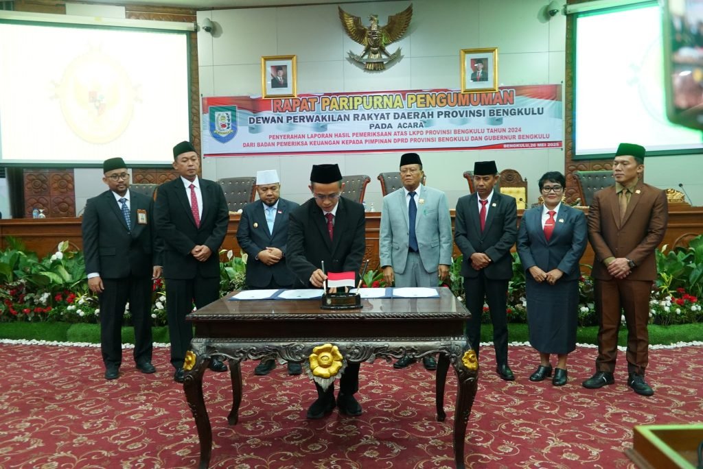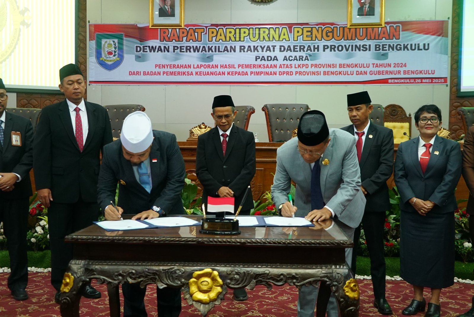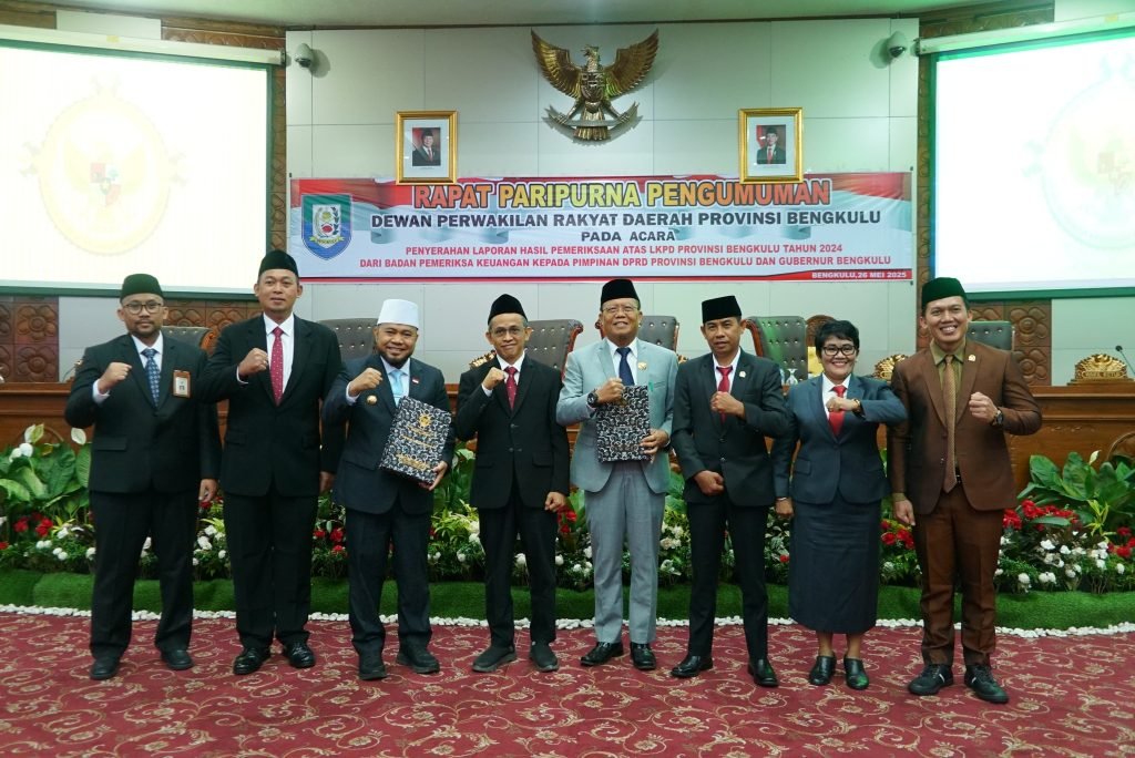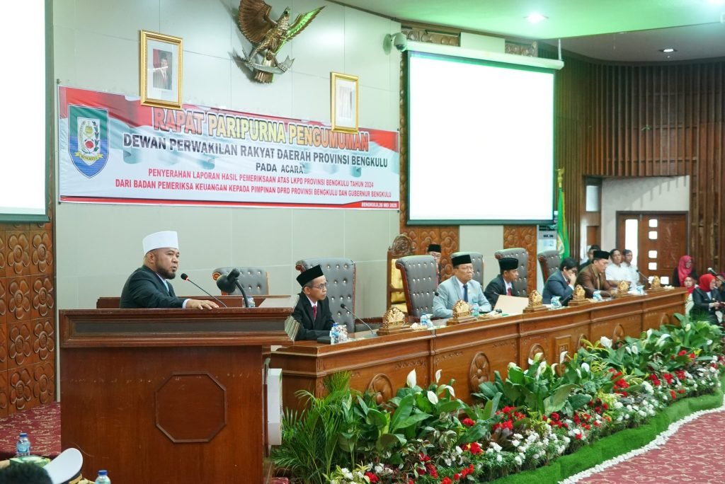 Melalui sidang paripurna dengan agenda penyampaian laporan hasil pemeriksaan oleh badan pemeriksaan keuangan pada Senin (26/5), Pemerintah Provinsi Bengkulu berhasil meraih predikat Wajar Tanpa Pengecualian dengan paragraf Penekanan Suatu Hal (WTP PSH).