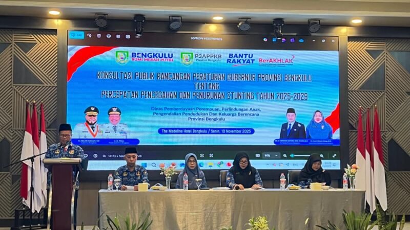 Pemerintah Provinsi Bengkulu melalui Dinas Pemberdayaan Perempuan, Perlindungan Anak, Pengendalian Penduduk, dan Keluarga Berencana (P3AP2KB) menggelar Rapat Konsultasi Publik Rancangan Peraturan Gubernur (Pergub) tentang Percepatan Pencegahan dan Penurunan Stunting Tahun 2025–2029, bertempat di Hotel Madeline Bengkulu, Senin (10/11).