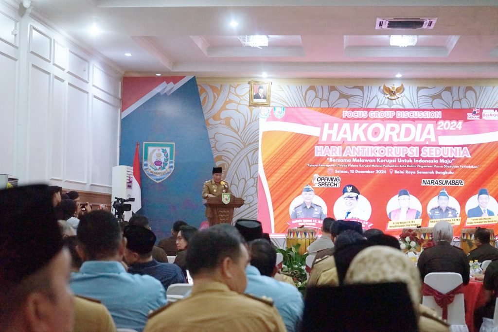 Pelaksana Tugas (Plt) Gubernur Bengkulu Rosjonsyah memberikan arahan pada peringatan Hari Antikorupsi Sedunia (HAKORDIA) Tahun 2024 yang berlangsung di Balai Raya Semarak Bengkulu, Selasa (10/12/2024).