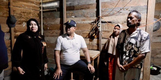 CALANG–Pj Gubernur Aceh, Dr. H. Safrizal ZA, M.Si, bersama istrinya Hj. Safriati, S.Si, M.Si, mengunjungi salah satu penerima rumah layak huni Pemerintah Aceh guna memverifikasi kelayakan penerima, di Gampong Alue Pande, Kecamatan Panga, Kabupaten Aceh Jaya, pada Minggu, (19/1/2025).