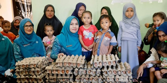 Sabang – Penjabat Ketua Tim Penggerak PKK Aceh, Hj. Safriati, S.Si, M.Si, memberikan bantuan telur kepada masyarakat Gampong Balohan, Kecamatan Sukajaya, Kota Sabang, Rabu (6/11/2024). Bantuan ini merupakan bagian dari upaya mendukung pemberantasan stunting di gampong tersebut.