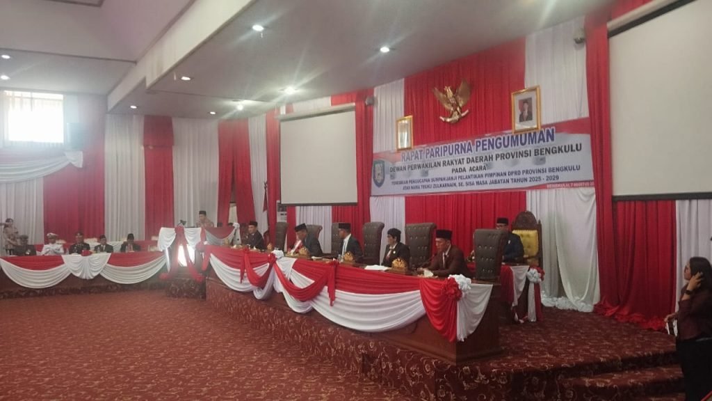 Penjabat Sekretaris Daerah (Pj Sekda) Provinsi Bengkulu, Herwan Antoni, menghadiri Rapat Paripurna DPRD Provinsi Bengkulu dengan agenda Peresmian Pengucapan Sumpah/Janji Pelantikan Pimpinan DPRD Provinsi Bengkulu Sisa Masa Jabatan 2024–2029, yang digelar pada Rabu (7/8) pukul 10.00 WIB di Ruang Rapat Paripurna DPRD Provinsi Bengkulu.