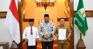 Banda Aceh – Plt Sekda Aceh Muhammad Diwarsyah menerima Laporan Hasil Pemeriksaan (LHP) yang diserahkan oleh Kepala Badan Pemeriksa Keuangan (BPK) Perwakilan Provinsi Aceh Triyantoro pada Jumat (3/1) di Kantor BPK Perwakilan Provinsi Aceh di Banda Aceh. Acara ini dihadiri oleh Ketua Komisi V DPR Aceh, Sekretaris DPR Aceh, Sekretaris Badan Penanggulangan Bencana Aceh serta sejumlah pejabat terkait lainnya.