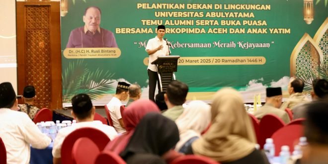 Hal tersebut disampaikan oleh Plt Sekretaris Daerah Aceh M Nasir, saat membacakan sambutan Gubernur Aceh pada Pelantikan Dekan di Lingkungan Universitas Abulyatama, Temu Alumni serta Buka Puasa Bersama Forkopimda dan Anak Yatim, di Ballroom Hermes Palace Hotel. Kamis (20/3/2025) sore.