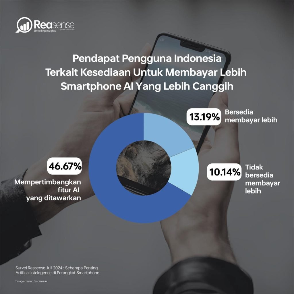 Lebih lanjut, survei Reasense ini juga menemukan bahwa 13,19% konsumen bersedia untuk membayar lebih untuk mendapatkan smartphone AI yang lebih canggih. Namun demikian, 46,67% responden lainnya menyatakan bahwa mereka masih mempertimbangkan untuk membayar lebih, tergantung pada fitur AI yang ditawarkan oleh produsen smartphone.