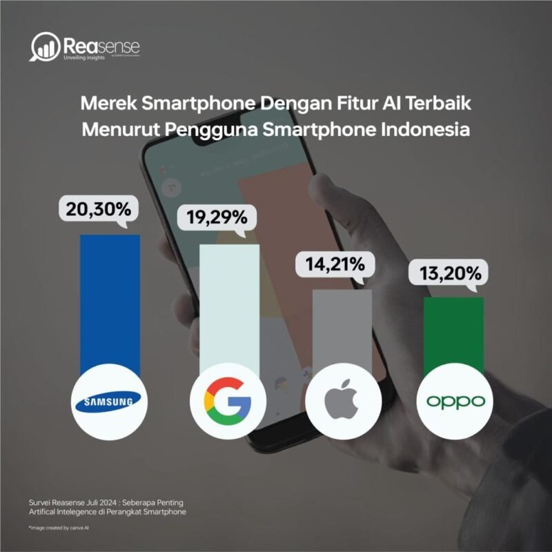 Jakarta, 17 Juli 2024 – Survei terbaru dari Reasense, divisi riset SEQARA Communications, mengungkapkan preferensi konsumen Indonesia terhadap perangkat smartphone berteknologi Artificial Intelligence (AI). Survei cepat atau quick survey ini melibatkan lebih dari 100 responden ini, yang mewakili konsumen, di berbagai kota di Indonesia melalui komunitas pengguna smartphone. Hasil survei menunjukkan bahwa Samsung (20,30%) dan Google Pixel (19,29%) menjadi smartphone dengan fitur AI terbaik, diikuti oleh Apple (14,21%) dan OPPO (13,20%).