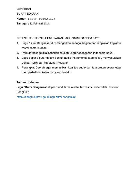 Pemerintah Provinsi Bengkulu melalui Sekda Provinsi Bengkulu H. Herwan Antoni mengeluarkan Surat Edaran dengan Nomor: B.500.12/2/DKS/2026 Tentang Pemutaran Lagu “BUMI SANGSAKA” Pada Kegiatan Resmi Pemerintah.