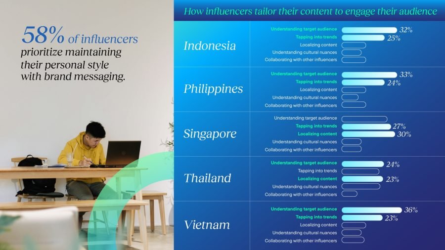 - Influencer akan lebih fokus pada komunitas, konten yang autentik, social commerce, dan kecerdasan buatan (AI) di tahun 2025. Membangun komunitas yang solid lewat acara influencer (28%) dan kolaborasi dengan influencer lain (23%) akan jadi salah satu tren utama, bersama dengan meningkatnya perhatian pada keaslian (28%). Banyak influencer juga sedang memantau perkembangan AI (36%) dan social commerce (33%) di kawasan ini, serta pengaruhnya terhadap dunia pemasaran influencer. Brand kini memiliki kesempatan besar untuk memimpin dan membentuk tren-tren baru ini ke depannya.