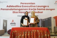 Admedika dan Eka Hospital jalin kerjasama penyiapan Executive Lounge demi kepuasan pelanggan. CEO AdMedika Dian Prambini (Kanan) dan Direktur Eka Hospital Cibubur dr. Sheirly…