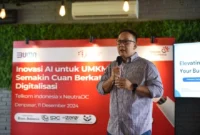 SVP Group Sustainability and Corporate Communication Telkom Ahmad Reza saat menyampaikan materi pada acara pelatihan optimalisasi artificial intelligence (AI) untuk UMKM lokal dengan tema “Inovasi AI untuk…