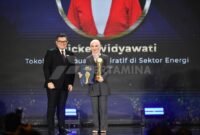 Direktur Utama Pertamina Nicke Widyawati menerima penghargaan tokoh perempuan inspiratif di sektor energi yang diberikan oleh Pemred Detik.com Alfito Deannova Ginting saat acara “detikcom…