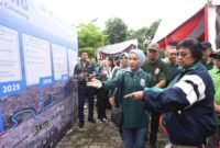 Menteri Lingkungan Hidup dan Kehutanan Republik Indonesia Siti Nurbaya Bakar bersama Direktur Utama Pertamina Nicke Widyawati melihat papan edukasi Gerbang Biru Ciliwung saat acara…