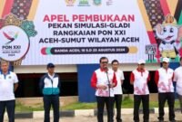 BANDA ACEH— Pj Sekda Aceh Azwardi membuka apel simulasi rangkaian pelayanan tamu Pekan Olahraga Nasional (PON) XXI 2024, di halaman Balai…