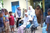 SIGLI–Pj Ketua Tim Penggerak PKK Aceh Mellani Subarni mengantar bantuan kursi roda sekaligus memberikan santunan untuk Asmaul Husna (27) yang menderita…