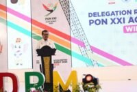 BANDA ACEH – Pj Sekda Aceh, Azwardi, memberikan sambutan resmi pada acara Opening Ceremonial Delegation Registration Meeting (DRM) PON XXI untuk…