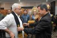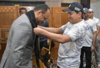 Wakil Gubernur Aceh, H. Fadhlullah, SE, mengalungkan selempang motif Aceh saat menyambut kedatangan Duta Besar Uni Emirat Arab untuk Indonesia,…