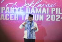 ACEH BESAR— Pj Gubernur Aceh, Dr. H. Safrizal ZA, M.Si membacakan puisi berjudul “Damailah Anak-Anak Indatu” dalam acara deklarasi kampanye damai…