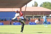 Penjabat Gubernur Aceh, Dr. H. Safrizal ZA, M.Si, menendang bola saat membuka secara resmi pertandingan perdana cabang olahraga sepakbola pada…