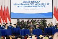 Presiden RI Joko Widodo (Jokowi) menghadiri Sidang Terbuka Institut Pertanian Bogor (IPB) dalam rangka Dies Natalis ke-60, Jumat (15/09/2023), di Kampus IPB Dramaga, Bogor,…
