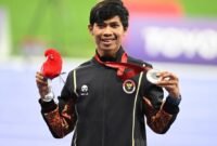 Presiden RI Joko Widodo (Jokowi) menyampaikan ucapan selamat kepada atlet para atletik Indonesia Saptoyogo Purnomo yang berhasil mempersempahkan medali pertama untuk kontingen Indonesia di…