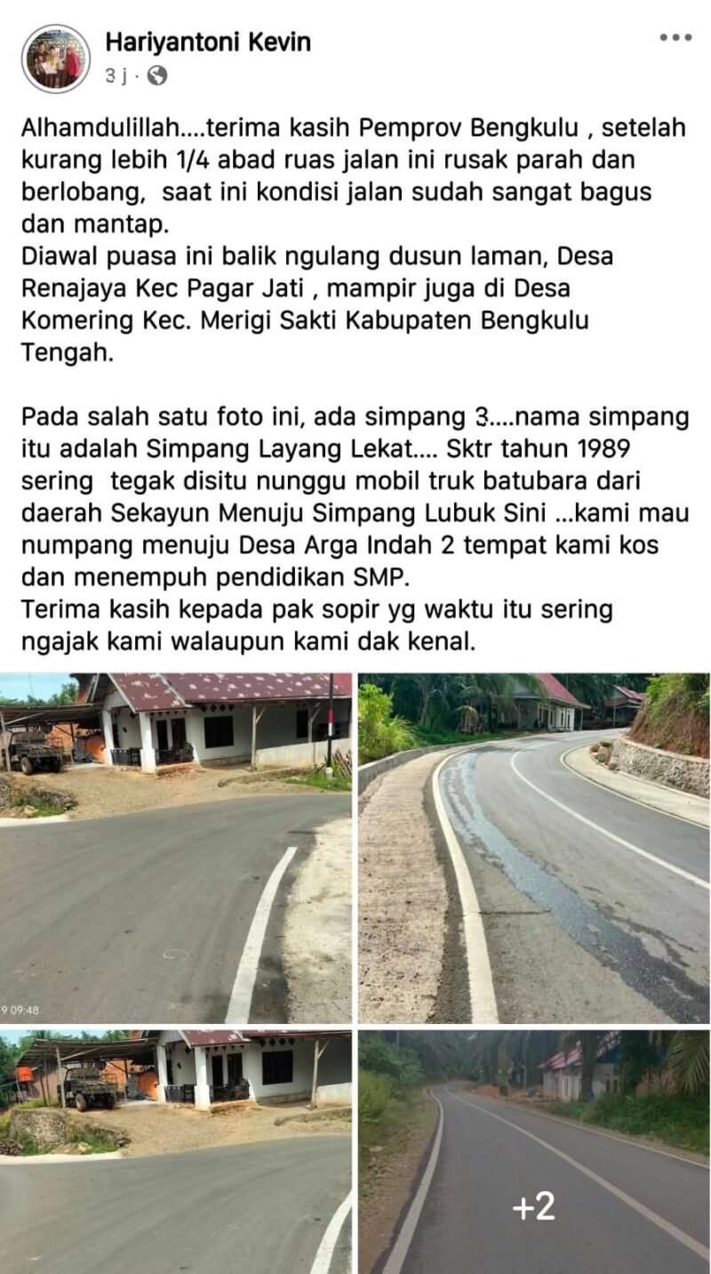 “Alhamdulillah, jalan yang dulu rusak parah dan penuh lubang, sekarang sudah mulus dan nyaman dilalui. Terima kasih kepada Helmi Hasan dan Pemerintah Provinsi Bengkulu. Jalan ini bukan hanya akses, tetapi juga menyimpan kenangan perjuangan masa sekolah kami dulu,” tulisnya.