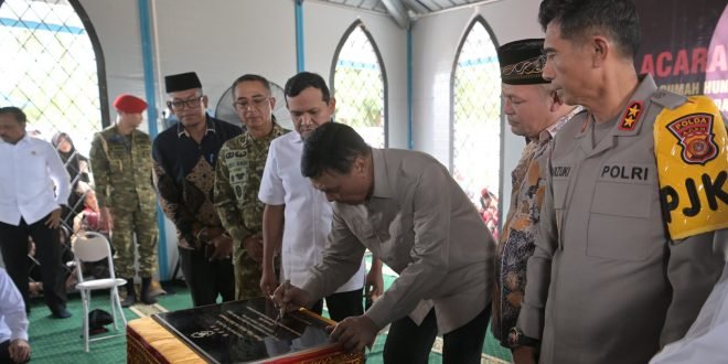 ACEH UTARA — Wakil Gubernur Aceh, Fadhlullah, mendampingi Menteri Koordinator Bidang Politik dan Keamanan Republik Indonesia, Djamari Chaniago, meresmikan hunian tetap (Huntap) bagi masyarakat terdampak bencana hidrometeorologi di gampong Kuala Cangkoi, Kecamatan Lapang, Kabupaten Aceh Utara, Sabtu (14/3/2026).