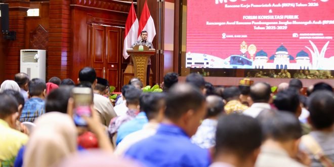BANDA ACEH— Wakil Gubernur Aceh, Fadhlullah, membuka musyawarah perencanaan pembangunan (Musrenbang) Rencana Kerja Pemerintah Aceh (RKPA) Tahun 2026 dan Forum Konsultasi Publik RPJMA 2025- 2029, di Anjong Mon Mata Komplek Meuligoe Gubernur Aceh, Kamis, (15/5/2025).