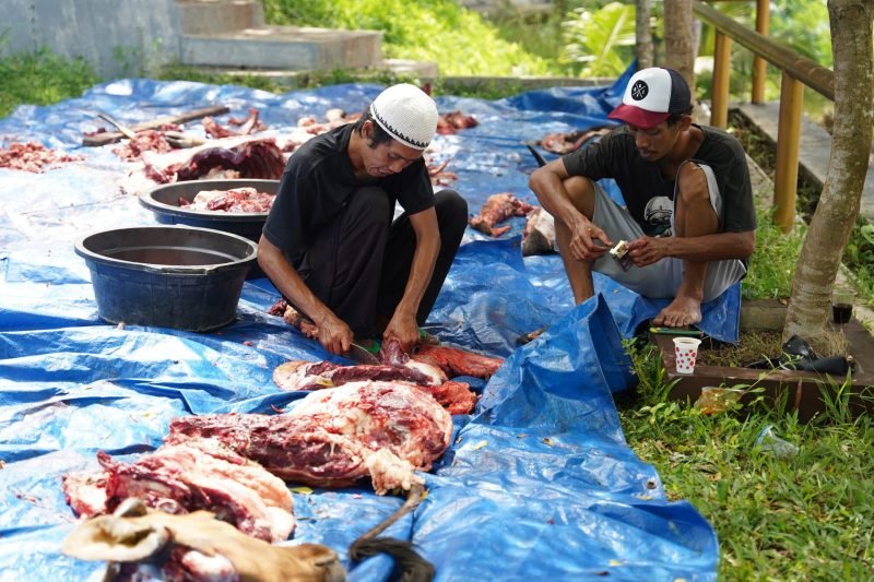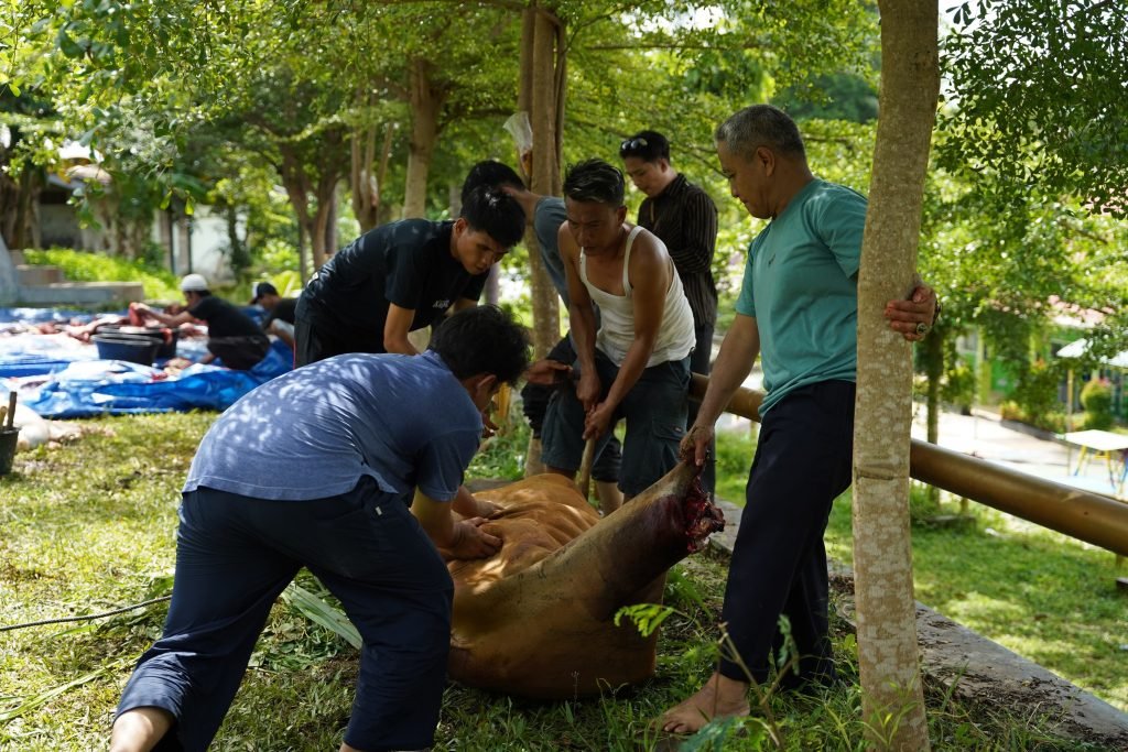 “Alhamdulillah, pagi ini kita sudah potong empat ekor sapi. Semuanya dari sumbangan para dermawan, hamba Allah yang ingin ambil bagian dalam program ‘Bantu Rakyat’ dari Pak Gubernur,” ujar Ustad Yulkamra, Sekretaris Masjid Raya, sambil berdiri di dekat tenda logistik.