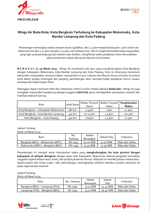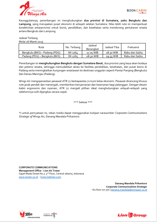 Dengan hadirnya rute baru ini, Wings Air semakin memperkuat konektivitas udara di Sumatera, mendukung pertumbuhan ekonomi daerah, serta memberikan solusi perjalanan yang lebih cepat dan efisien bagi masyarakat.